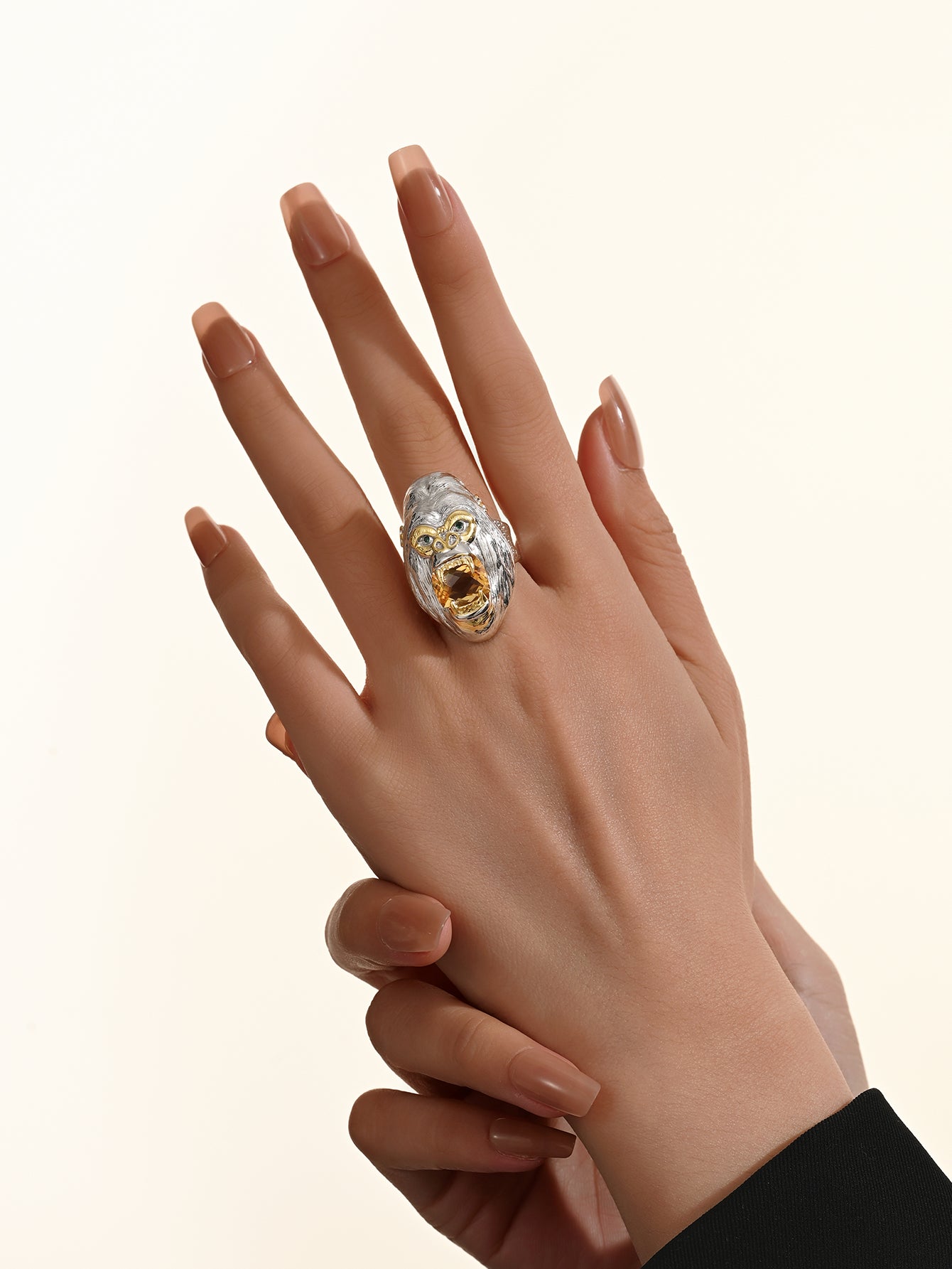 Unique design: Inspired by the ape head, the facial features of the ape are vividly portrayed, and the hair texture is delicate and lifelike. The eyes and details of the ape head are cleverly embellished with 18K gold, which forms a sharp contrast with the silver part to enhance the visual impact. The open mouth is inlaid with a large piece of natural citrine, as if it contains endless energy. The overall design is full of wildness and power, full of personality, and highlights the wearer's unique taste and uninhibited attitude.