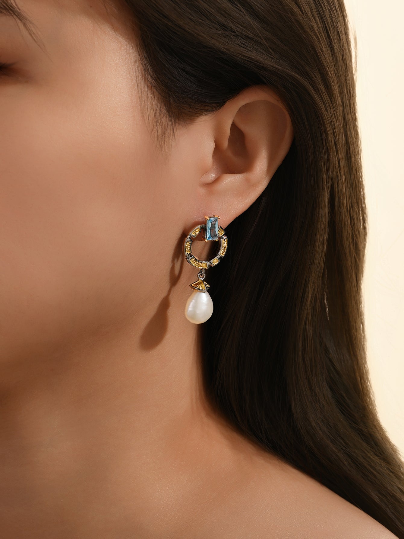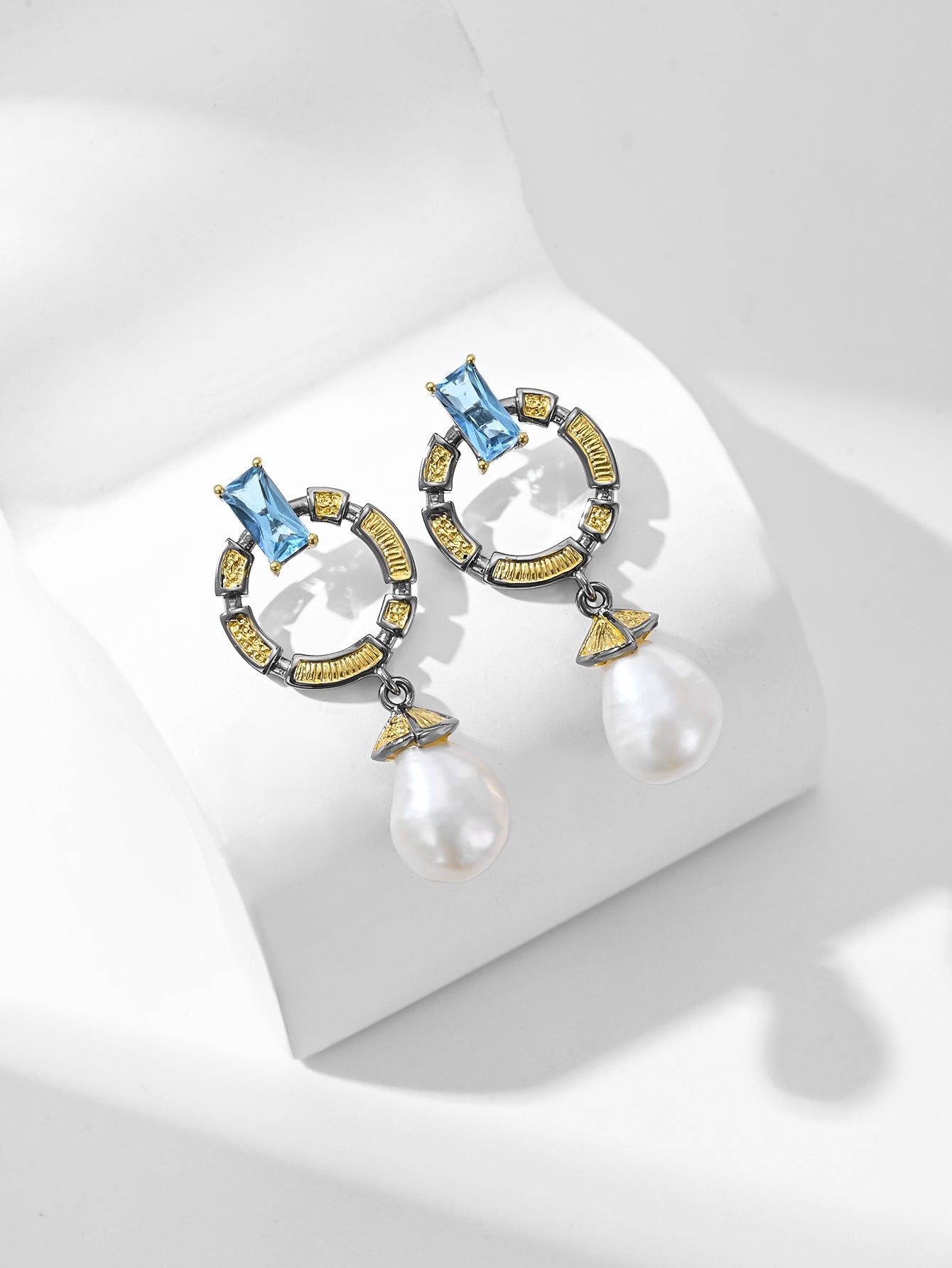 The blue topaz inlaid on the earrings is fresh and profound in color. In the gem culture, topaz symbolizes sincere emotions, beautiful hope and pure friendship, and can bring positive energy and good blessings to the wearer. The pearls hanging below are round and full, exuding a warm and soft luster. Since ancient times, the pearls have symbolized purity, nobility and perfection, and represent flawless beauty.