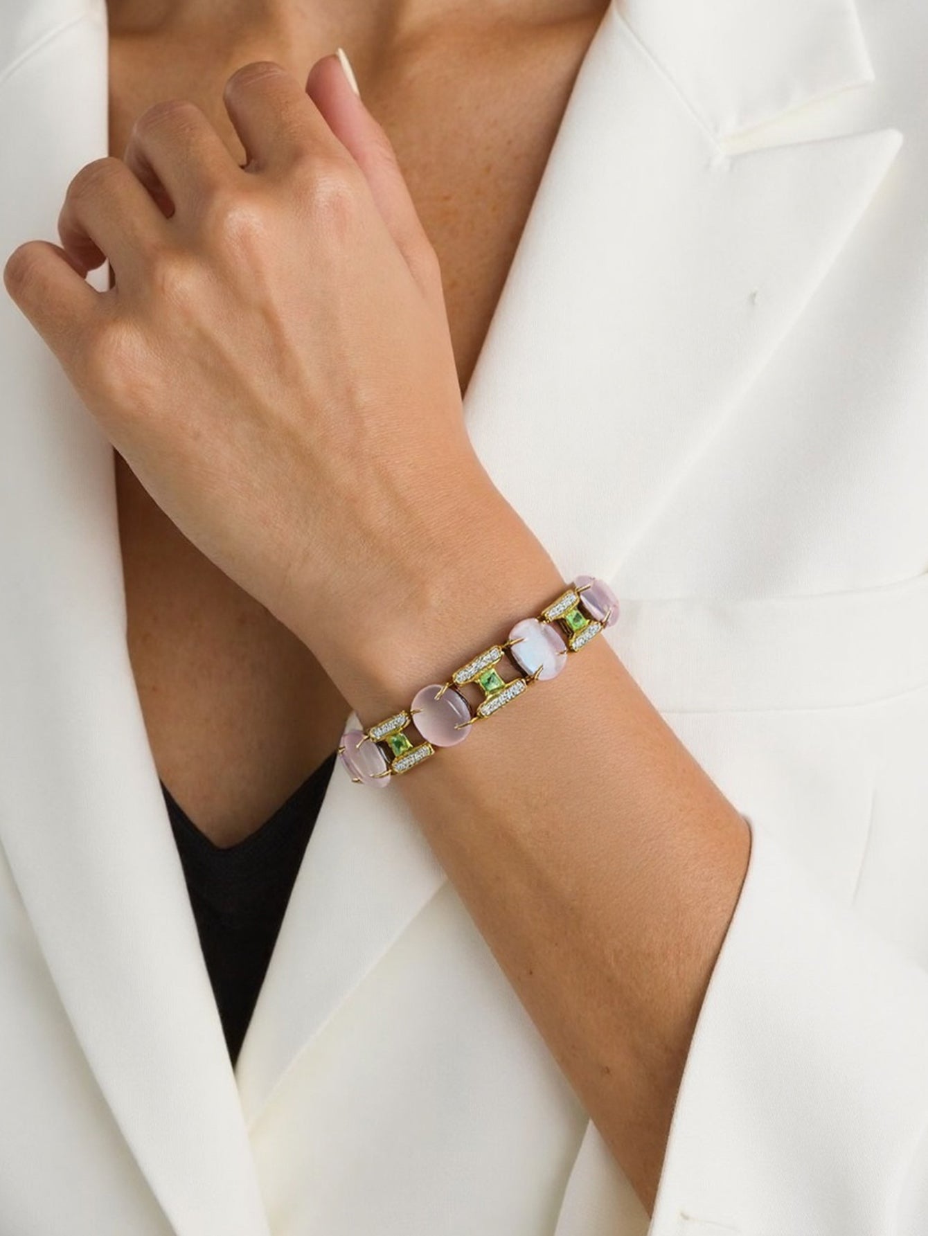 This bracelet is a perfect blend of natural rose quartz and peridot, meticulously inlaid. Rose quartz, with its soft pink hue like the first light of dawn, is known as the “stone of unconditional love” in the West. It’s believed to open the heart chakra, attracting love, friendship, and inner peace, bringing a touch of romance and warmth to your life.