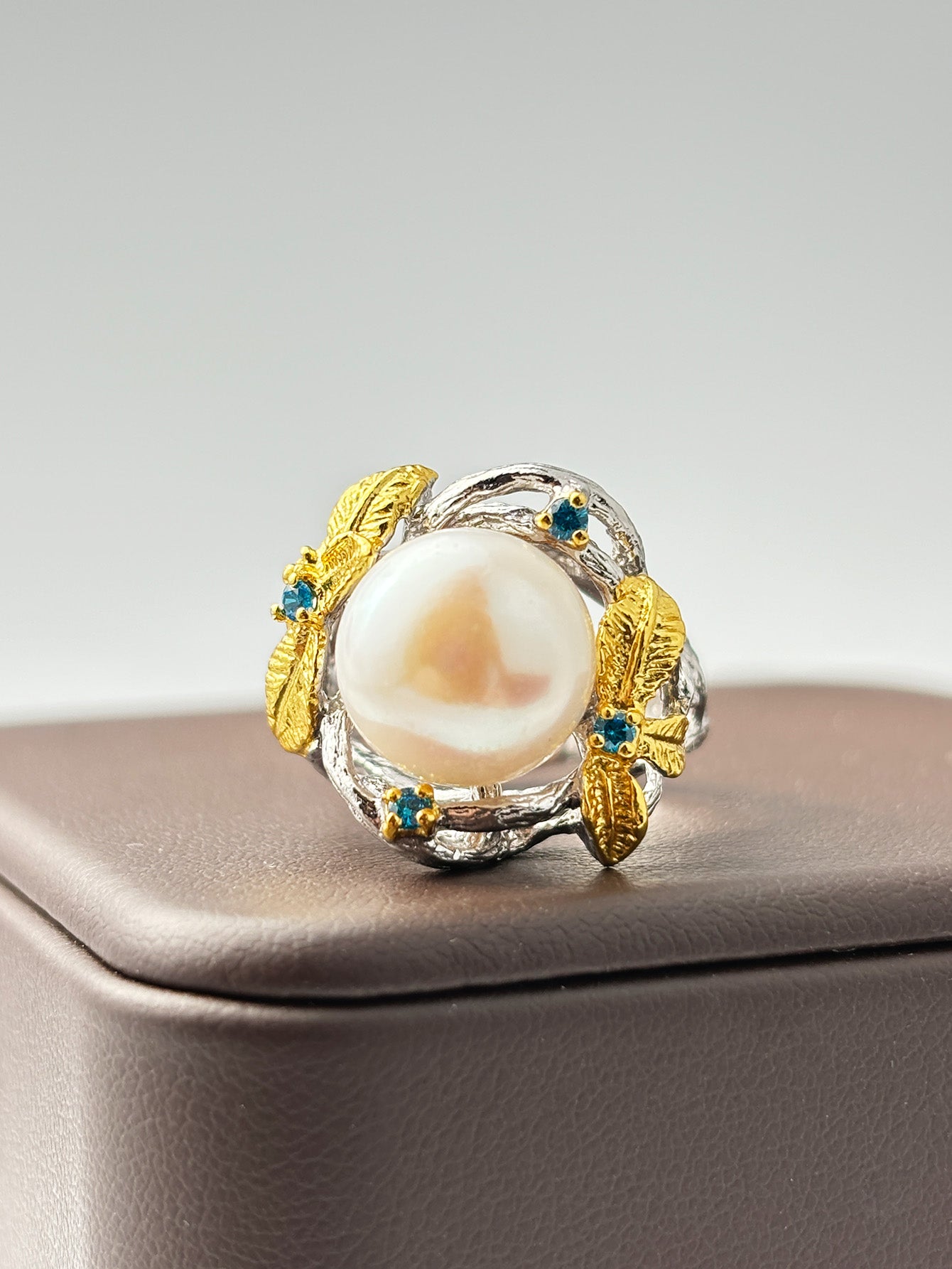 The design of the ring is inspired by the agility and elegance of nature, and the gold and silver metals are cleverly combined to create a unique "golden branches and jade leaves" shape. The golden part stretches out like branches and leaves, and its surface texture is delicate and layered, as if covered by the golden glow of the sun, full of retro and gorgeous atmosphere. Surrounded by the "golden branches and jade leaves", a few small blue zircons are dotted like stars, and the soft light of the pearls complements each other, adding a sense of agility and mystery. These sapphires are bright in color, exquisitely cut, and reflect charming light, adding color and vitality to the design of the entire ring, making it more eye-catching.