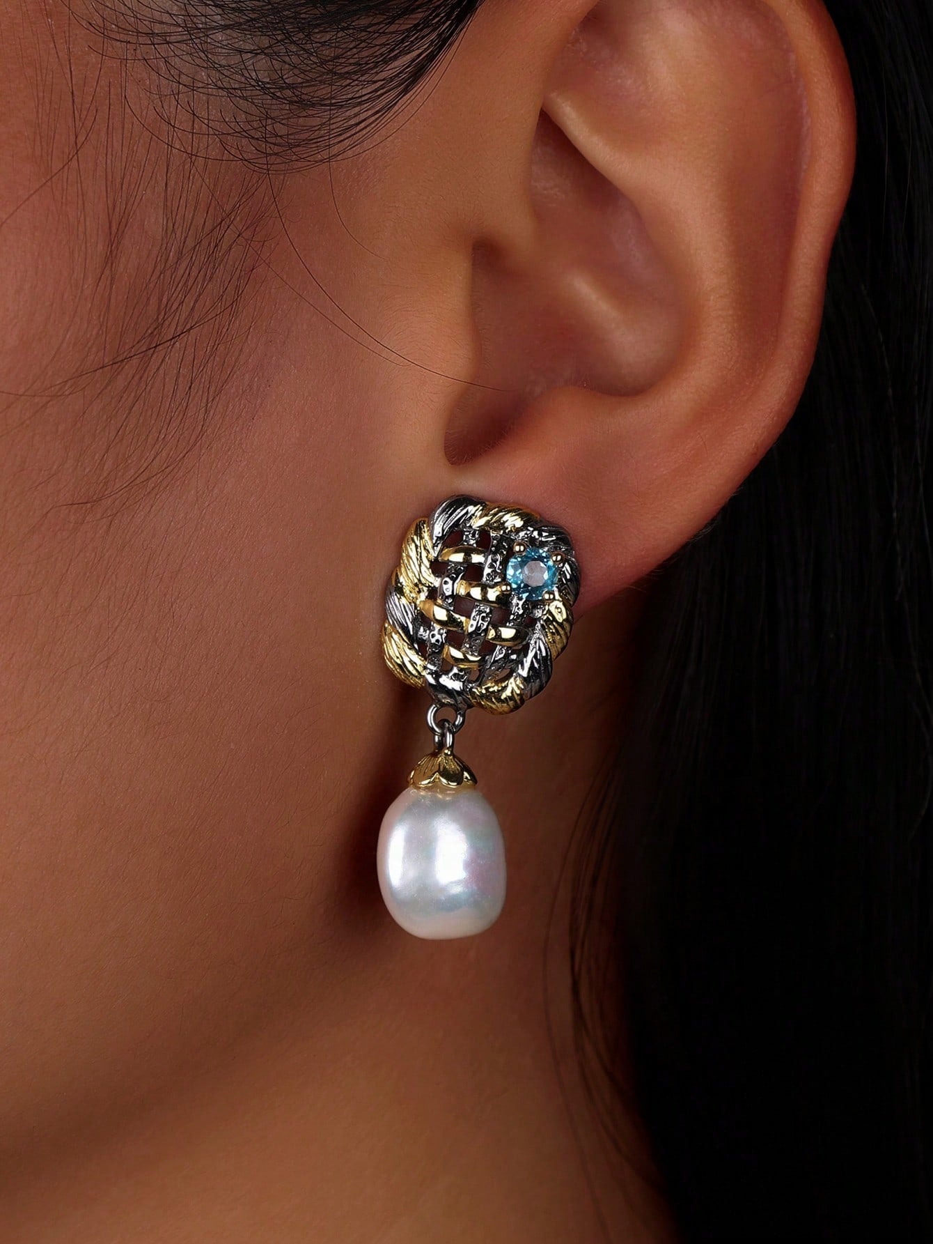 This pair of earrings is carefully crafted from 925 silver, and cleverly uses gold and silver colors to create a beautiful and layered look. The gold and silver interwoven part on the upper part of the earrings is exquisitely crafted, like an exquisite work of art, exuding a luxurious but elegant atmosphere.
